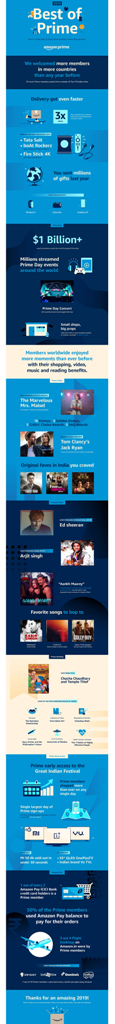 Bengaluru, December 18, 2019:What a year for Prime members! Today, Amazon is celebrating the Best of Prime 2019, revealing how Prime members chose to enjoy the best of shopping and entertainment from Amazon this past year.Prime brings members the best of Amazon in India with unlimited free oneand two-day delivery, early access to sale events, video streaming, ad-free music and much more. Members worldwide enjoyed more moments than ever before with their video, music and reading benefits.85 percent of Prime members enjoyed at least 1 benefit during Great Indian Festival 2019. More members worldwide signed up for Prime during the past year than any year before. 2x more Prime members joined from outside of Top10 Indian cities in 2019 than in 2018.