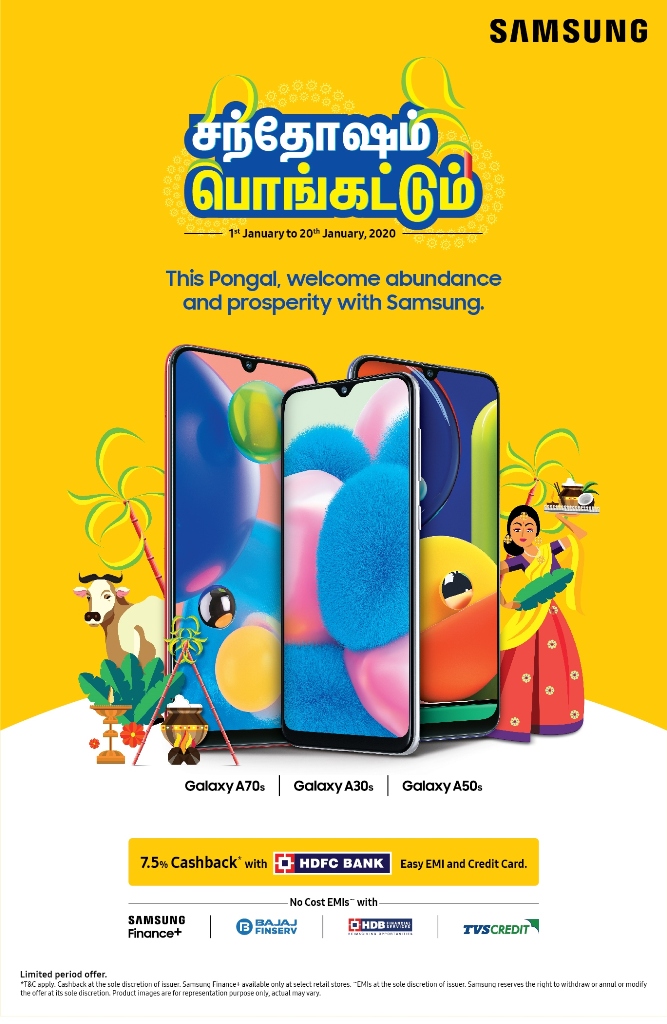 The offer will be valid from January 1, 2020 through January 20, 2020. During these twenty days, smartphones such as Galaxy A20/20s, Galaxy A30/A30s, Galaxy A50/A50sand Galaxy A70/A70s will be eligible for 7.5% cashback offers. These offers will beexclusive to HDFC Credit Cards, Debit Cards(only EMI) and HDFC CD Loans.