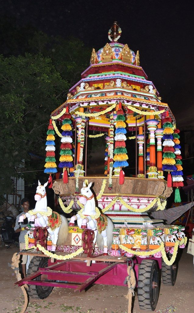 The artistically made wooden chariot stands tall at 18.5 feet and 9 feet wide, with 8 pillars and has intricate works of 210 idols. The wooden chariot is the workmanship of the Tamil Nadu award-winning sculptor AR.K. Ekambara Aasari, whose team took a record 66 days to complete the work.