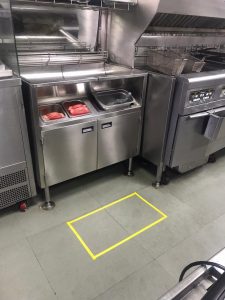 - Social distancing markings at ordering counters, collection counters and kitchens