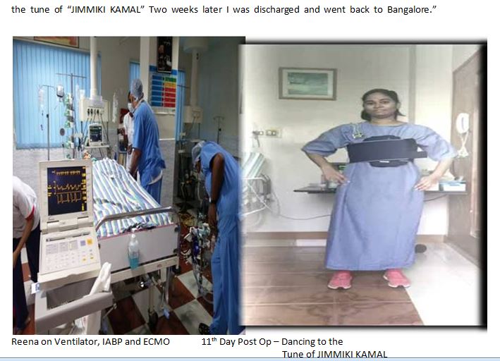 She Narrates- “My heart function was detoriating rapidly and I was advised to go back to Chennai where I had the 1st transplant. I was taken by an ambulance to Chennai and I knew that I reached the hospital entrance and I became unconscious. I was told that after I reached the hospital I had a cardiac arrest. I was resituated and was put on a ventilator with high supportive drugs. Inspite of these preliminary supportive measures, my condition was detoriating rapidly. I was initiated on another cardio vascular supportive system known as IAPB (Intra Aortic Balloon Pump). This is a Balloon which was inserted through my groin blood vessel and the balloon was inflating and deflating in my large blood vessel, namely aorta. Inspite of 8 hours of ventilator and IABP support, my condition was still detoriating. The doctor informed my relatives that I would need another transplant and they were making arrangements for getting a suitable donor. I was half conscious with blurred vision and not properly thinking, everything was vague to me. I could over hear the discussion among doctors and since my condition was detoriatingrapidly they decided to initiate me on another support mechanism known as ECMO (Extra corporeal membrane oxygenation). I was initiated on this new sophisticated support system as the doctors were not prepared to accept my death. TRANSTAN had raised the red flag for me, contacted all the hospitals and it was lucky for me as there was a donor available after 3 days of these main supports namely ventilator, IABP and ECMO. A young donor was identified and who was supposed to give the heart for another waiting patient, thanks to the Donor Hospital and TRANSTAN, emergency allotment was given for me. The permission came and the heart was harvested in the night and I had my 2nd Heart Transplant. The next morning I was fully awake and they had already removed the ECMO support and the IABP during the Transplant itself. I was only on Ventilator support for another 12 hours and I was removed from the Ventilator and I could breathe on my own and see my sister, Raju and my doctors. I was made to sit up and in 24 hours I was made to walk and on 11th day I was dancing in the ICU to the tune of “JIMMIKI KAMAL” Two weeks later I was discharged and went back to Bangalore.”