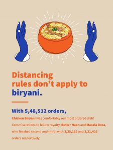 As far as food is concerned, data shows that when people weren’t whipping up Dalgonas or baking Banana Bread, they found comfort in their Biryanis, which continued to rule the roost with nearly 5.5 lakhorders. Clearly, no distancing rules applied to the ever-favorite Biryani! This was followed by orders for Butter Naan and Masala Dosa.