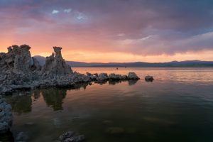 Over a million years old and covering nearly 105 square miles, Mono Lake, is situated just north of Mammoth Lakes. The alkaline lake has no outlet, so evaporation is the only way water leaves the lake, making it 2.5 times saltier and 80 times more alkaline than the ocean. The unique biosphere provides food to millions of migrating birds.