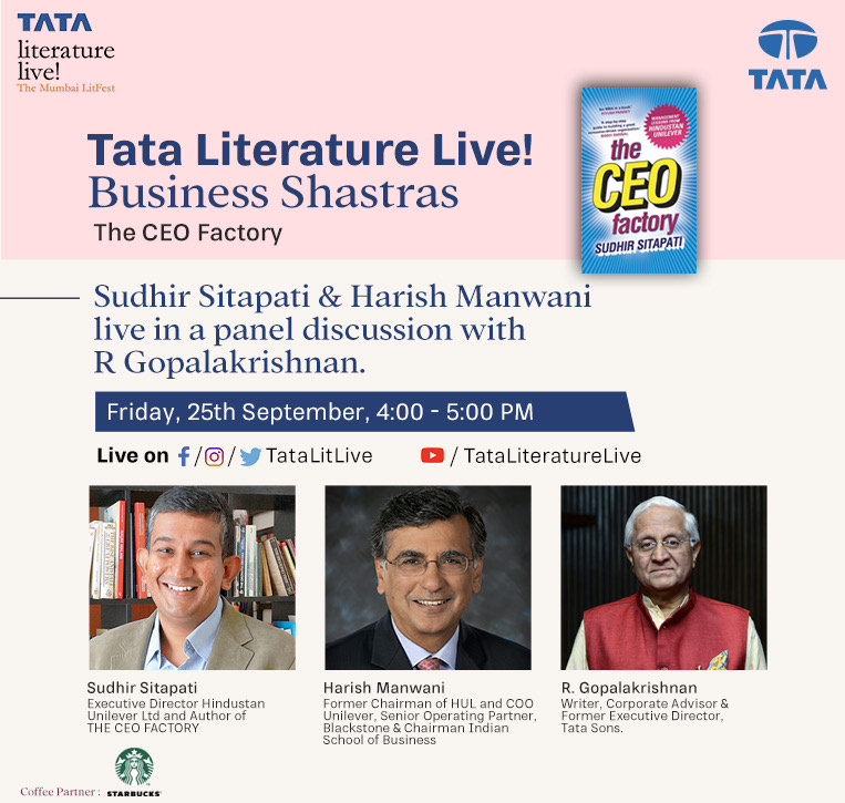The sixth session of Tata Literature Live! Business Shastras presents Mr. Sudhir Sitapati, Executive Director, Hindustan Unilever Ltd along with Mr. Harish Manwani, Former Chairman of HUL and COO, Unilever, Senior Operating Partner, Blackstone & Chairman Indian School of Business (and Director, Tata Sons) in a fascinating conversation around Sitapati’s insightful and riveting book – The CEO Factory: Management Lessons from Hindustan Unilever. The enthralling discussion will be chaired by Mr. R. Gopalakrishnan, Writer, Corporate Advisor and Former Executive Director, Tata Sons.
