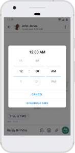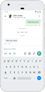 Users can schedule SMS by simply selecting the icon while messaging and choose a date and time. Your message will be sent then, and you will always be able to see it scheduled in your chat. This feature is available for Android users only.