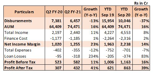 - Aggregate disbursements in Q2 FY 21 were at ₹ 6,457 Cr as against ₹ 7,381 in Q2 FY 20, which is a decline of 13%. Disbursements in H1 FY 21 were at ₹ 10,046 Cr as against ₹ 15,954 Cr in the previous year registering a decline of 37% Y-on Y.