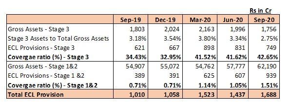 CIFCL asset quality as on 30th September 2020, represented by Stage 3 assets stood at 2.75% with a provision coverage of 42.65%, as against 3.18% in H1 of FY20 with a provision coverage of 34.43%. The Stage 3 assets have improved from 3.80% in Mar 20 to 2.75% in September 20. Apart from the provision coverage represented above against stage 3 assets, additional provisions of Rs. 549 crs have been created towards Stage 1 and Stage 2 assets to cover any contingencies arising out of the Covid-19 pandemic fallout. The total provisions currently carried against the overall book is 2.64% as against the normal overall provision levels of 1.75% carried prior to the Covid-19 pandemic, representing an increase of nearly 50%.