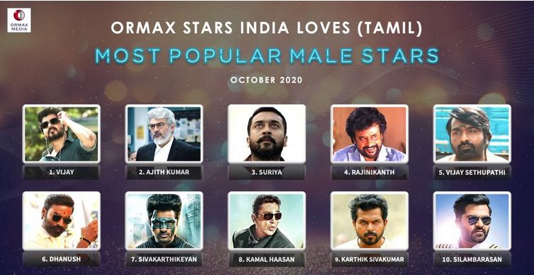 Chennai, November 19, 2020: Media consulting firm Ormax Media has been tracking star popularity in Hindi, Hollywood, Tamil & Telugu cinema. The track, called Ormax Stars India Loves, is based on consumer research conducted across India, in more than 400 cities & towns. With theatres re-opening in October 2020, the results of the latest edition become particularly relevant.
