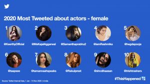- Vijay (@actorvijay) and Mahesh Babu (@urstrulymahesh) were the most mentioned male Tamil and Telugu stars, respectively; while Keerthy Suresh (@KeerthyOfficial) topped the female stars’ lists