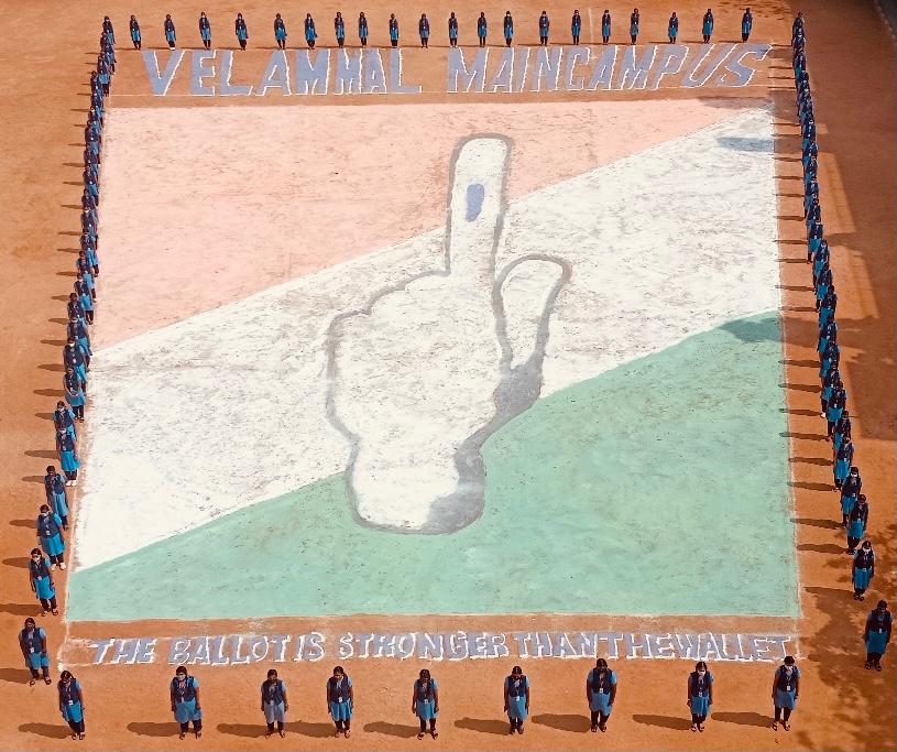 உலகையே அச்சுறுத்திக் கொண்டிருக்கும் தொற்றுநோய்களுக்கு இடையே 2021 ஏப்ரல் 6 ஆம் தேதி நடைபெறவிருக்கும் தமிழக சட்டமன்றத் தேர்தல்களை மனதில் வைத்து பள்ளி வளாகத்தில் உள்ள மைதானத்தில் ,7000 சதுர அடி பரப்பளவு கொண்ட ரங்கோலி வண்ணக் கோலமானது மிகப்பிரம்மாண்டமாக வரையப்பட்டது. ‘”வாக்களிப்பது உங்கள் உரிமை–உங்கள் சக்தி'” என்ற வலுவான செய்தியை இது வலியுறுத்தியதுடன் தேர்தலில் பங்கேற்று