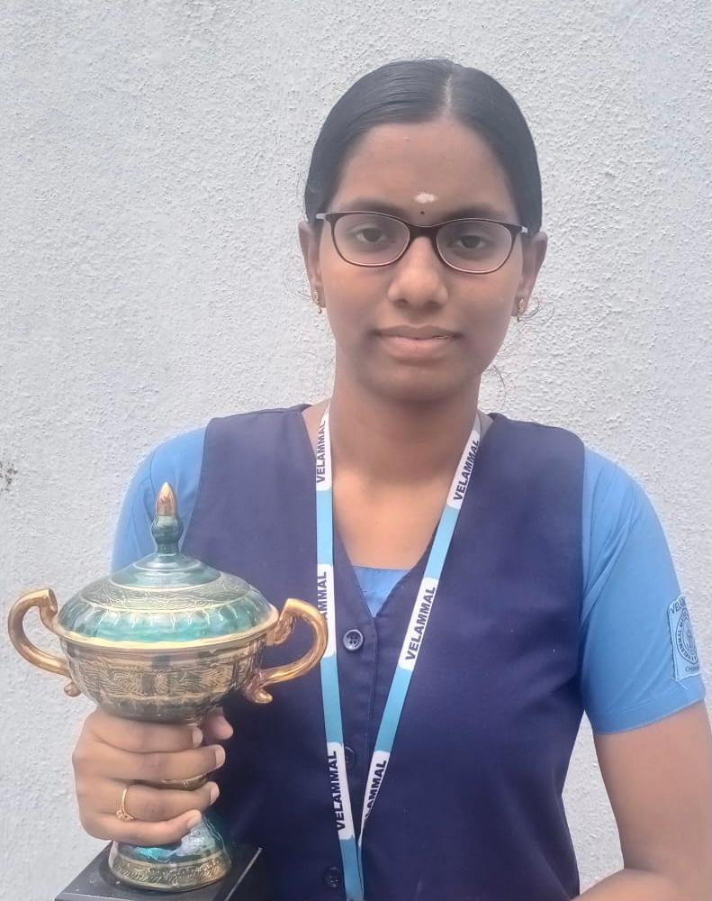 Miss V Rindhiya,16, Std12 of Velammal Main, Mogappair Campus clinched the Gold medal in the recently held National Under 18 Girls Chess Championship organised by the All India Chess Federation.This selection tourney was held between 10th June, 2021 and 12th June,2021.