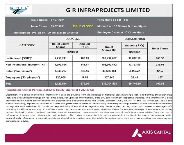 Chennai, July 09, 2021: G R Infraprojects Limited (“GRIL” or “Company”), an integrated road engineering, procurement and construction (“EPC”) company with experience in design and construction of various road/highway projects; received bids of 83,33,04,538 shares against the offered 81,23,594 equity shares, as per the 5:00 pm data available on the bourses.