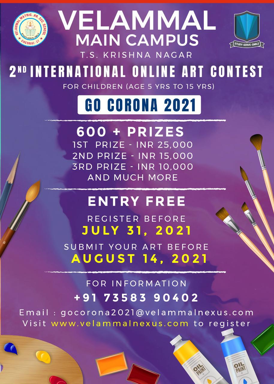 GO CORONA 2021 என்ற தலைப்பில் வேலம்மாளின் 2 வது சர்வதேச இணையவழி ஓவியப்போட்டி , உலகெங்கிலும் உள்ள நாடுகளிடமிருந்து பெரும் வரவேற்பைப் பெற்றுள்ளது, இது பல ஆயிரம் பதிவுகளைப் பெற்றுள்ளது. 5 வயது முதல் 15 வயது வரையிலான பங்கேற்பாளர்கள் அமெரிக்கா, ஆஸ்திரேலியா, கனடா, ஐக்கிய அரபு எமிரேட்ஸ், ஜெர்மனி, கத்தார், ஜப்பான், சிங்கப்பூர் மற்றும் 24 க்கும் மேற்பட்ட நாடுகளில் இருந்து பதிவு செய்துள்ளனர்.