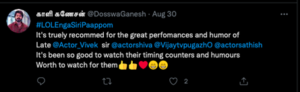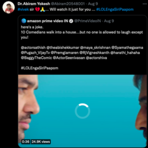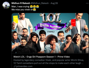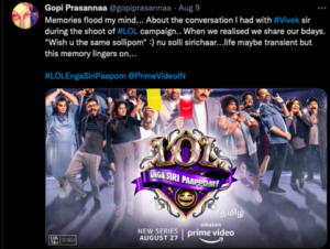 Memories flood my mind… About the conversation I had with #Vivek sir during the shoot of #LOL campaign.. When we realised we share our bdays. "Wish u the same sollipom" 🙂 nu solli sirichaar…life maybe transient but this memory lingers on…#LOLEngaSiriPaapom @PrimeVideoIN pic.twitter.com/J9Ez1kxbBf