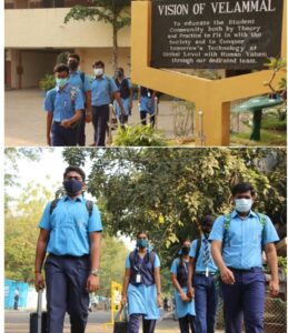 The Covid pandemic which began IN March 22, 2020 resulted in schools shutting down considering the safety of the students. Amidst expectations and excitement, Velammal Main school, Mogappair campus reopens for the students on 1st September, 2021. Velammal has taken all possible safety measures as per the government SOP to keep the student environment safe and secure. Before the arrival of the students, all class rooms, restrooms and all sensitive areas were sanitized. Safety measures including sanitization, thermal scanner facility, usage of mask and social distancing marking to avoid crowd have been implemented.