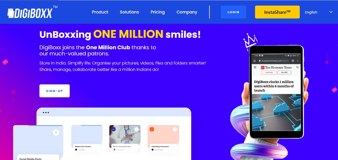 Bangalore, 5th October, 2021: India’s first and only Swadeshi public cloud storage platform, Digiboxx, introduced InstaShare today. InstaShare is India’s first heavy file transfer portal with 2 GB file size space with an active link validity of 45 days. This Made in India product is a way to share files easily, quickly and securely. Based on the strong principle of making service clutter-free and simple, Digiboxx launched InstaShare providing uninterrupted sharing, protects your privacy and an ad-free experience to the users across the globe.
