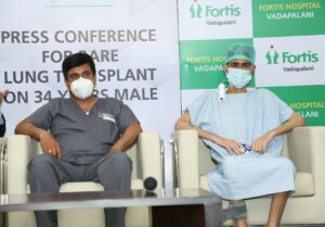 Chennai, Oct 28, 2021: A Team of doctors led by Dr. Govini Balasubramani at Fortis Hospital Vadapalani, successfully performed a rare lung transplant earlier this month on a 34-year-old male. The rare and challenging surgery lasted for 7 hours where both lungs were successfully transplanted to the patient in spite of the multiple health challenges such as small chest cavity, multiple chest tube insertions on the sides of the lungs and low BMI.