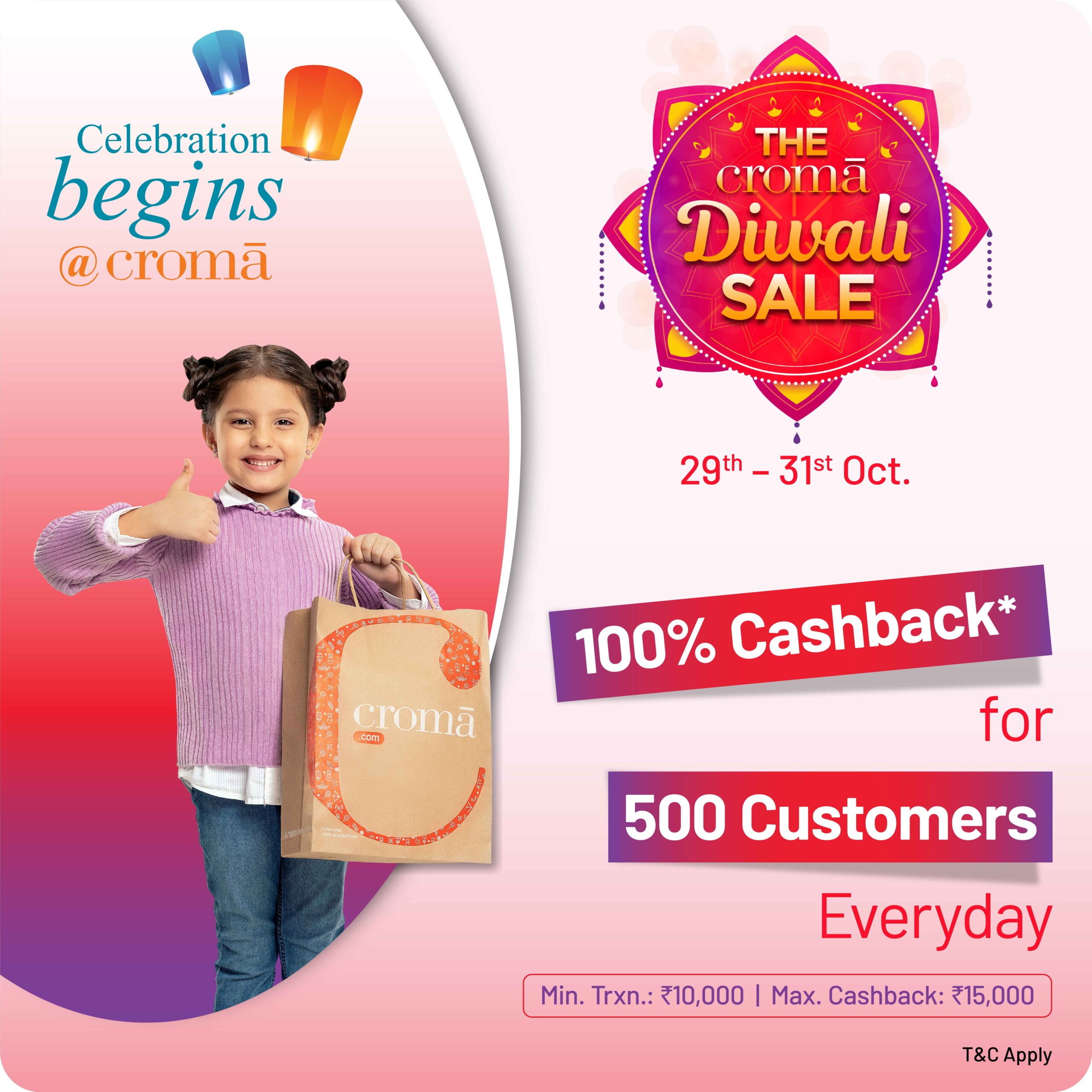 - Croma is extending 100% cashback up to INR 15,000 for 500 customers at the Croma stores