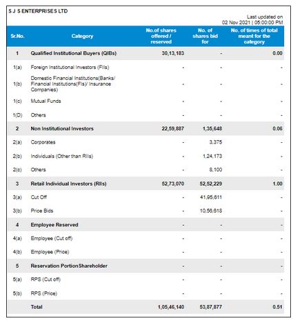 Chennai, November 2, 2021: SJS Enterprises Limited (“Company”), one of the leading players in the Indian decorative aesthetics industry in terms of revenue in fiscal 2020, received bids of 53,87,877 shares against the offered 1,05,46,140 equity shares, as per the 5:00 pm data available on the bourses.