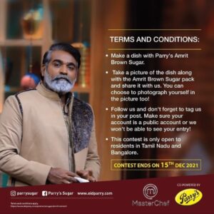 Speaking on this, Mr. Balaji Prakash, Senior Vice President, Sales and Marketing, E.I.D. Parry (India) Limited said, “The meet and greet contest is an extension of our association with Masterchef India Tamil, 2021. Amrit Brown Sugar has been an innovation out of the Parry’s stable and as “The Better Sugar” alternative it has been an instant hit amongst the consumers. The contests around Parry’s Amrit Brown Sugar is an effort on our part to give them some sweet memories as they experience the product and share about the brand.”