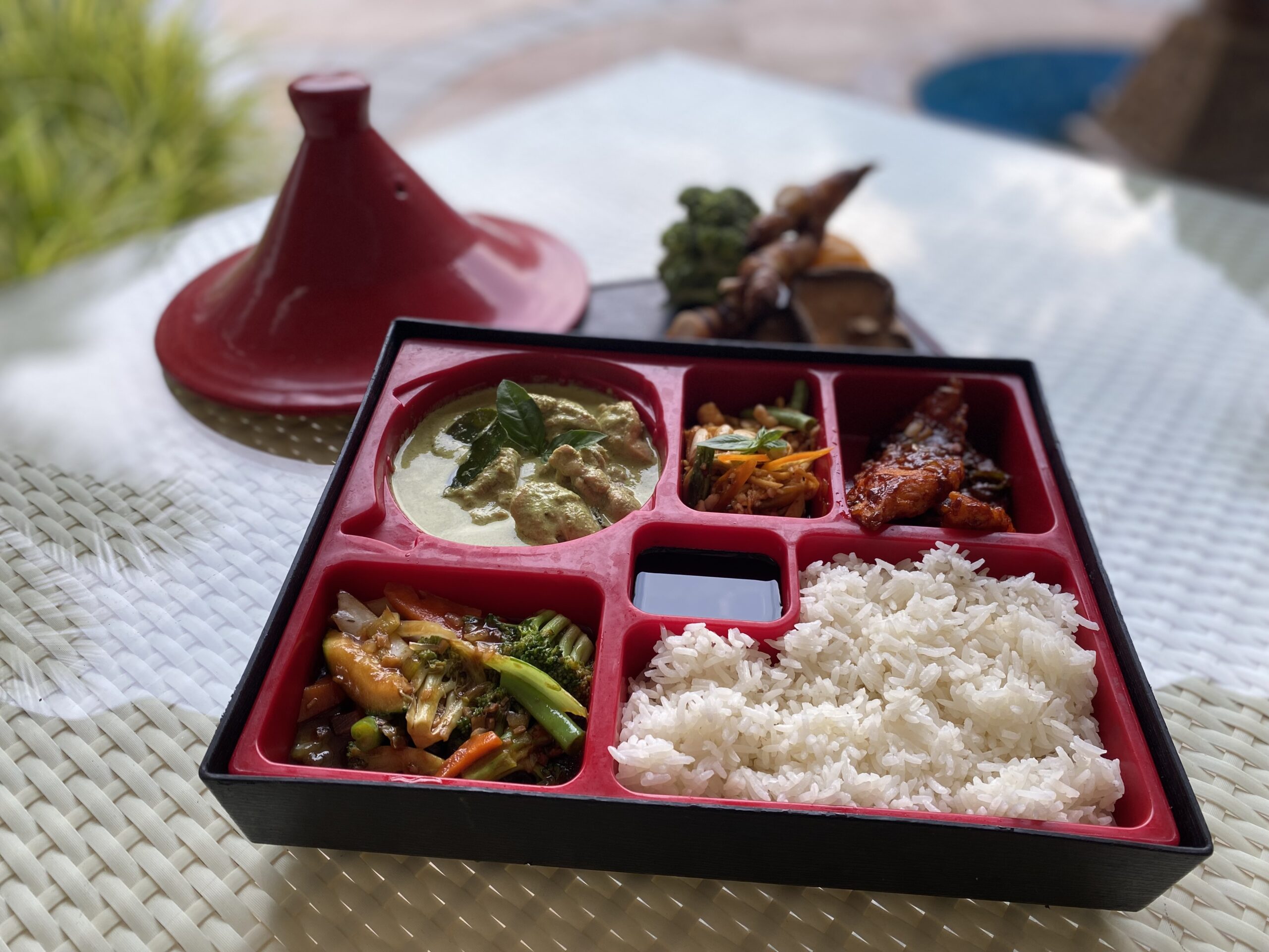 Chef’s bento box will consist of Soup, Bento with starter and main course followed by dessert. The menu includes signature delights like Tom Kha (Thai style creamy coconut soup flavored with Thai ginger, Kaffir lime leaf and spices); Som Tam (Thai raw papaya salad with tangy tamarind dressing); Pla namprik (wok tossed chilly basil fish); and Gaeng kiew wan gai (Thai green curry with chicken and basil). Savour these with accompaniments like Phad phak (wok tossed exotic vegetables); Steamed Jasmine rice or Khao phad je (stir fried rice with vegetables), and finish off the meal with the delicious Tub tim grob (rose scented water chestnuts in sweetened coconut cream).