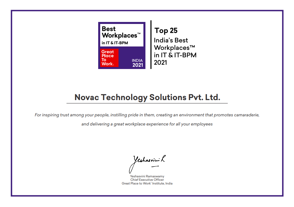 NOVAC recognized as one of India’s Top 25 Best Workplaces in IT & IT-BPM, 2021