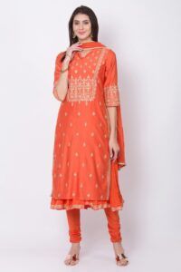 If you love embroidered suits with sitara work, then this orange suit set by Biba is for you. It is a set of four, a straight cut kurta with matching inner, matching solid churidar and crushed dupatta. Kurta comes featuring thread and sitara work on the yoke, on sleeves’ hem and along the slit on the sides. The Main fabric of this suit set is Art Silk and kurta comes with cotton lining, so that you feel comfortable wearing it all day long.