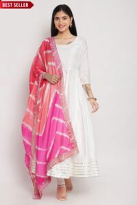 A gorgeous Anarkali suit set in white. The set combines an Anarkali Kurta, churidar and dupatta. Kurta comes with solid bodice accentuated with lace piping on the hemline and dori tie at back neck. Paired with matching white churidar and styled with a contrasting pink Leheriya print dupatta, this set is a festive must buy. Kurta also features cotton lining. This set comes with a mask