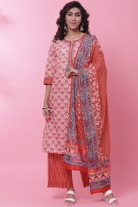 Step up your style game as you wear this fun printed red cotton suit set from our range. Made from pure cotton, the kurta features a straight silhouette, round neck and three forth sleeves. Complete the look with striped slim pallazzo pants and printed dupatta.
