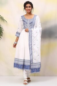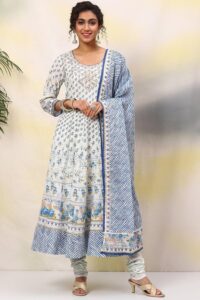 White and Blue Cotton Anarkali Suit Set: INR 6,995