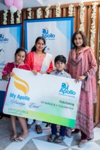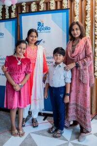 To honour his feat, Ms. Suneeta Reddy, Managing Director, Apollo Hospitals Group felicitated Nidhish and his mother S. Vijayalakshmi who has been the pillar of support behind the success of Nidhish. The family was presented with an exclusive One Apollo Membership which comes with various benefits. Also seen in the picture is the sister of Nidhish, Kaarnika.