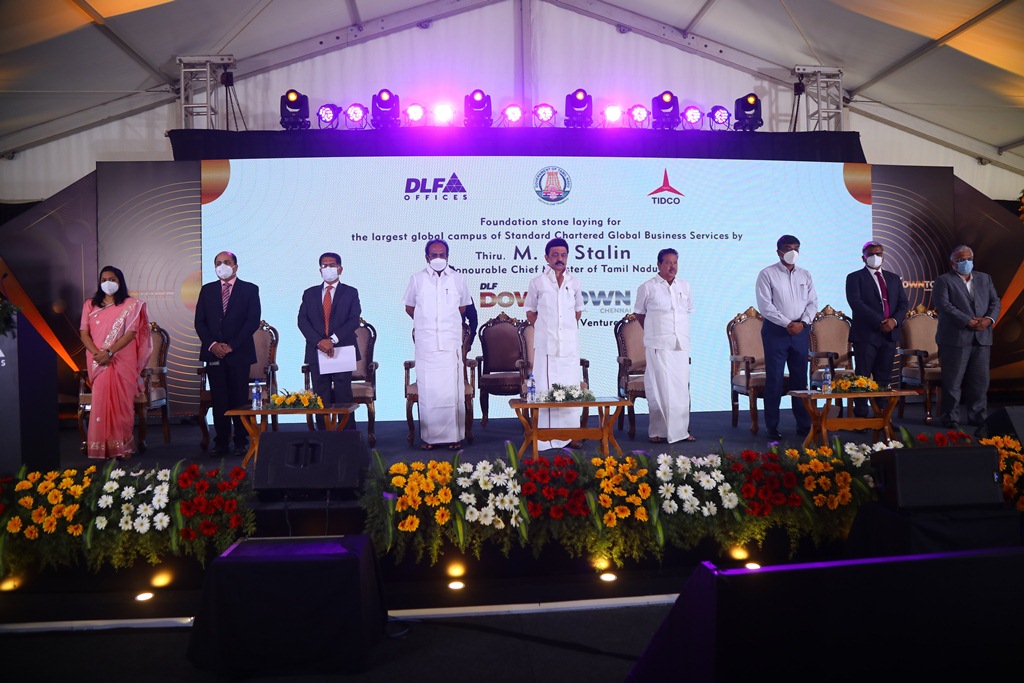 Chennai, March 14, 2022: Hon’ble Chief Minister, Tamil Nadu, Thiru. M.K Stalin today laid the foundation stone for Standard Chartered Global Business Services’ largest global office campus in DLF Downtown Taramani Chennai. DLF is building an office campus for Standard Chartered Global Business Services for approx. 1 Mn Sq. Ft. which is to be a first of its kind futuristic workspace with open, experiential offices in the post-pandemic era.