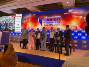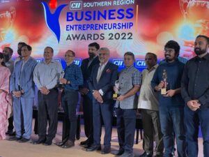 The 10th edition of the Business Entrepreneurship Awards 2022 was hosted in Chennai, and Mr. CK Ranganathan, Chairman CII Southern Region and CMD, Cavinkare presented the award in the presence of Mr. Hans Raj Verma, Additional Chief Secretary, Government of Tamil Nadu & CMD, Tamil Nadu Industrial Investment Corporation (TIIC) and Mr. Kamal Bali, President & MD, Volvo Group India.