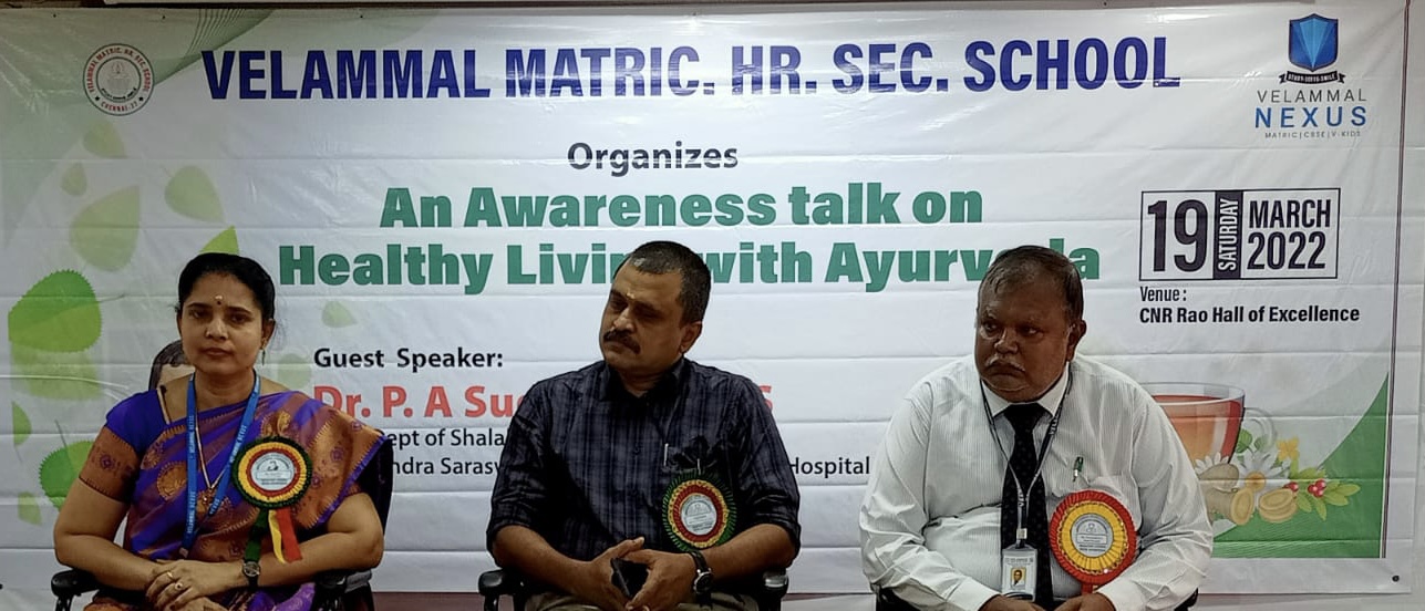 Velammal Main School, Mogappair Campus hosted an awareness session on ‘Healthy living with Ayurveda’ for the teaching faculty by the Chief Guest Dr. P A Sudhir, HOD, Dept. Of Shalakyatantram, Sri Jayendra Saraswathi Ayurveda College on 19th March,2022 in CNR Hall  of Excellence.