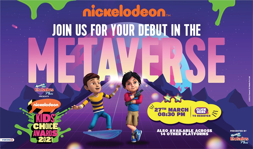 இந்த ஆண்டு பல புதுமைகள் கடையில் இருப்பதால், அல்பைன்லிபே எக்லர்ஸ் பிளஸ் நிக்கலோடியோன் கிட்ஸ் சாய்ஸ் விருதுகள் 2021 வழங்குகிற நிக்இந்தியா.காம் இல், நிக், சோனிக், நிக் HD+, டாடா பிளே(Ch. Nos 664 மற்றும் 665), வயாகாம்18 இன் OTT இயங்குதளங்களான வூட், வூட் கிட்ஸ் உடன் ஜியோ டிவி மற்றும் ஜியோ டிவி + மற்றும் டிஜிட்டல் ஆகியவற்றில் உங்களைப் பதிவு செய்வதன் மூலம் மெட்டாவர்ஸ் இல் யூட்யூப், ஃபேஸ்புக் மற்றும் இன்ஸ்டாகிராம் போன்ற தளங்களில் மார்ச் 27, 2022 ஞாயிற்றுக்கிழமை இரவு 8.30 மணிக்கு ட்யூன் செய்யவும்.