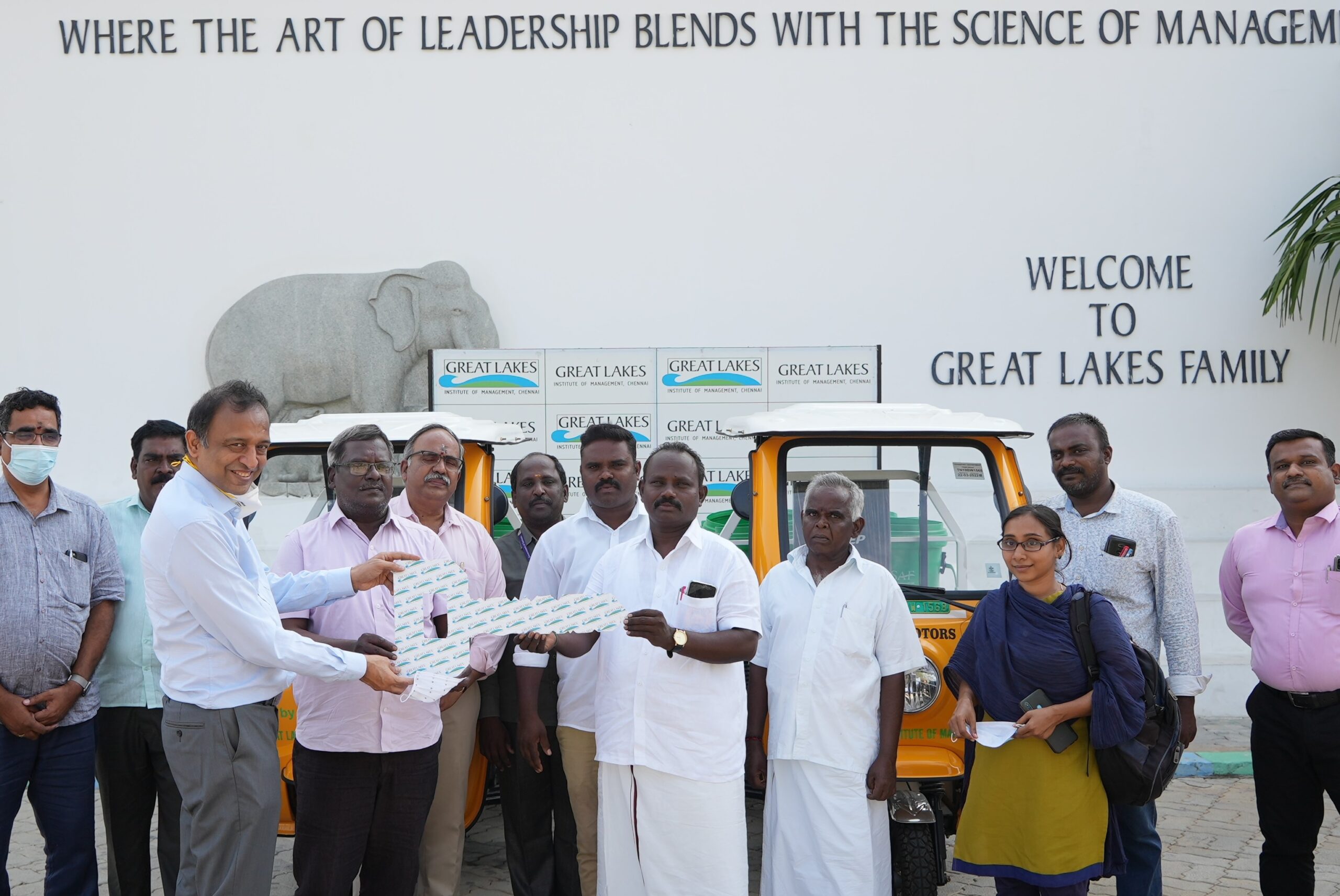 The Dean of the institute, Dr. Suresh Ramanathan presented the vehicles to T. Senkeni, President of Manamai village panchayat in the presence of Panchayat Vice president S. Poornima, BDO Mr. Jeyabal and Deputy BDO Mr. Duraivel. Chief Administration Officer, Mr. K Subaash, Finance Manager, Mr. Venkit and other staff and faculty members from Great Lakes.