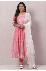 This pink anarkali suit set can be your perfect choice of outfit for dressing things up in a gathering. Made from pure cotton, it features an anarkali style printed kurta with a round neckline and three forth sleeves. Matching churidar and dupatta give a finished look.