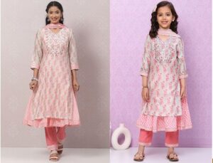 Mothers who love their little divas to bits are already acing the style twin-game with matching outfits. Mom-daughter duos can opt this powder blue art silk layered straight suit set from BIBA’s Mom n Me collection. It features a flared inner lining with pink stripes. Wear the straight kurta on top which features a round neckline with mirrorwork and three forth sleeves. Complete your look with coral pink pants and sky-blue net dupatta.