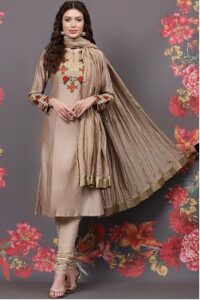 Discover latest designer styles with our exclusive range from Rohit Bal. This beige suit set is made from a blend of cotton and silk. The set includes a heavy floral embroidered kurta featuring a straight silhouette with round neckline and three forth sleeves. Complete your look with solid toned churidar and crinkled dupatta.
