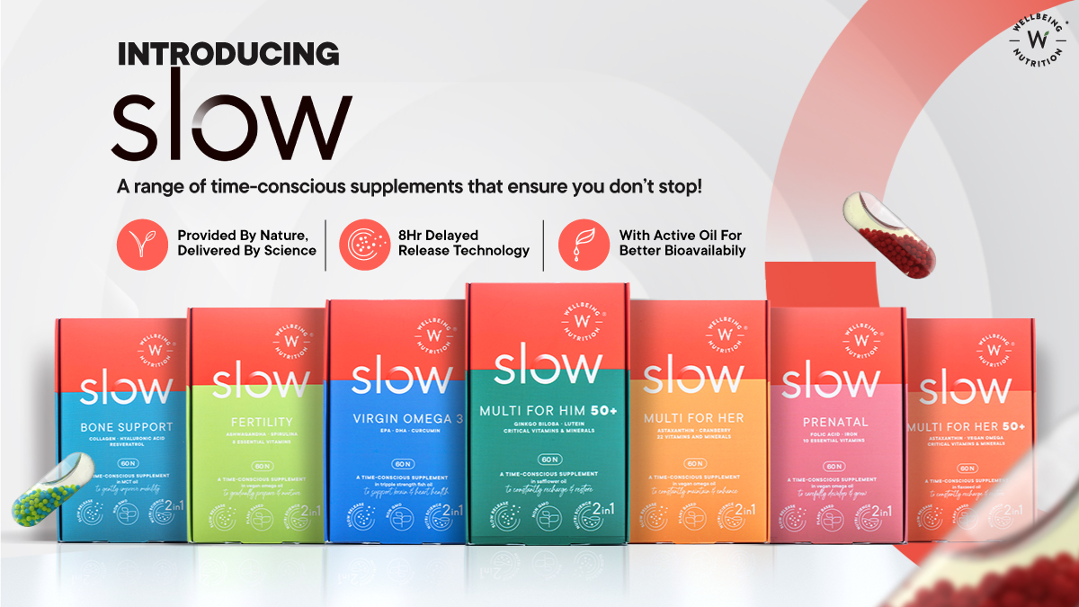 National, April 25, 2022: Wellbeing Nutrition, one of India’s fastest-growing plant-based nutrition company, is about to launch SLOW – the first ever time-conscious range of nutraceuticals for men and women. Comprising 13 supplements, each formulation has been specifically designed for a host of unique health and wellness needs such as fertility support, bone health, weight loss, to everyday multi-vitamins & nutrition, among many others.
