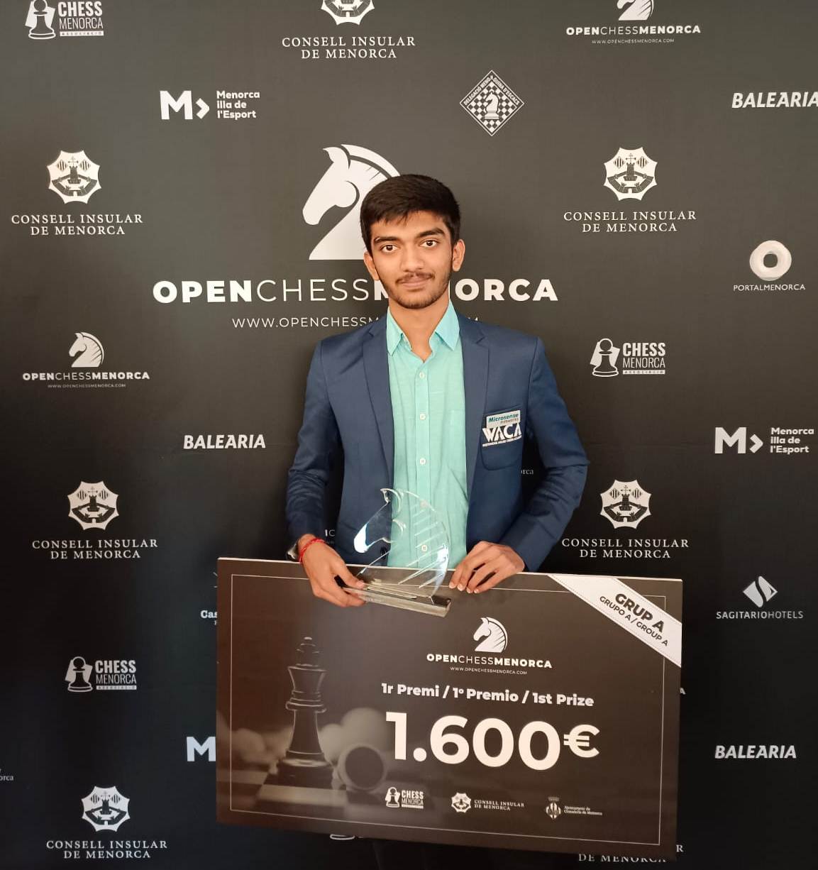 Grandmaster Gukesh D, Std X of Velammal Vidyalaya, Mel Aynambakkam has won the First Prize, his second title in eight days at the Menorca Open Chess Tourney and earned 1,600 Euros as prize money held in Menorca, Spain, on Sunday.
