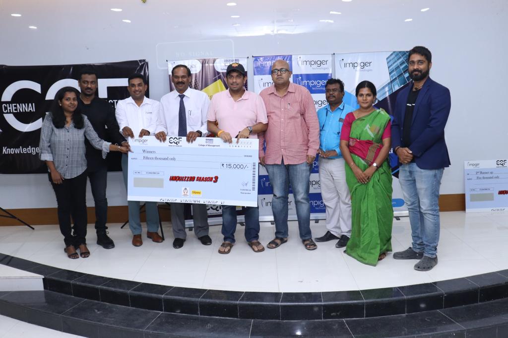 The quiz was divided into two rounds – Prelims and Finals. The prelims round consisted of 30 questions which had to be answered in the given time. The top 9 participants from this round qualified for the finals. In the Finals, contestants participated in 5 rounds of questions. The event was presided over from Impiger Technologies by Saravanan.T, President – HR & CHRO and Saravanakumar R, Director of Marketing & Communications and from SRM College of Management by Dr.Sundar, Dean &Dr.Arulmoli, Head of MBA. The first prize included a cash prize worth Rs 15,000 and a certificate while the first & second runner-up received a cash prize worth Rs 10,000 and Rs 5,000 along with a certificate respectively.