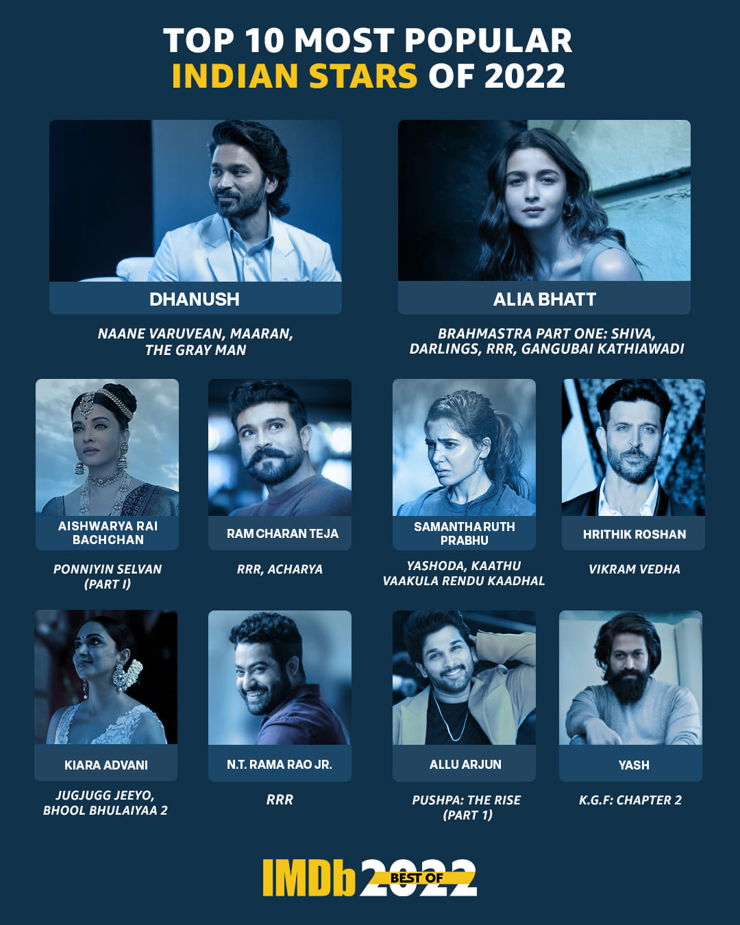 “People around the world turn to IMDb to learn more about Indian cinema, web series, and stars, and our Top 10 list of Most Popular Indian Stars has established itself as the benchmark for determining global popularity and recognizing career milestones and breakthrough moments,” said YaminiePatodia, head of IMDb India. “Artists across varied regions are being celebrated worldwide, which is a testament to the magnitude of talent across the country. While actors like Dhanush are being recognized and paired opposite Hollywood stars like Ryan Gosling and Chris Evans, we also witnessed N.T. Rama Rao Jr. and Ram CharanTeja being celebrated for the magnum opus film, RRR. Actress AishwaryaRaiBachchan’s return to films also received widespread appreciation by critics and fans.”