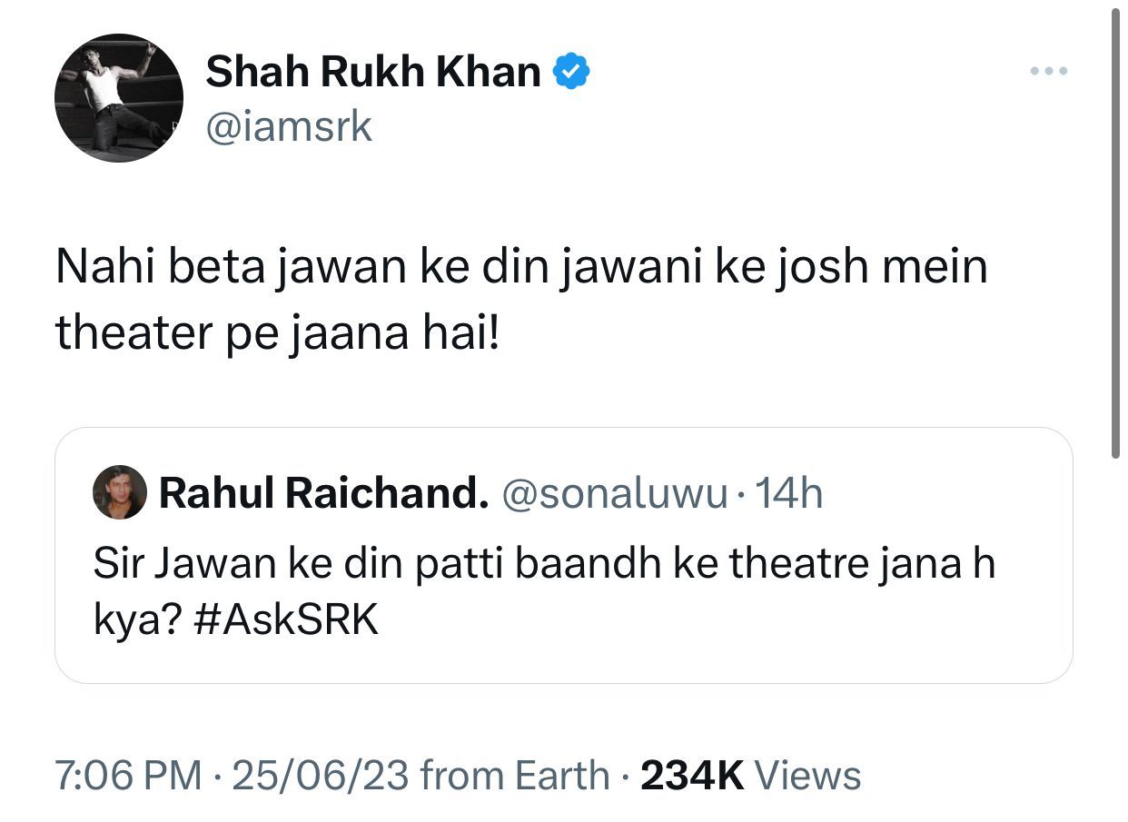 Reverting to a user’s question, SRK wrote, “Nahi beta, jawan ke din jawani ke josh mein theater pe jaana hai!”