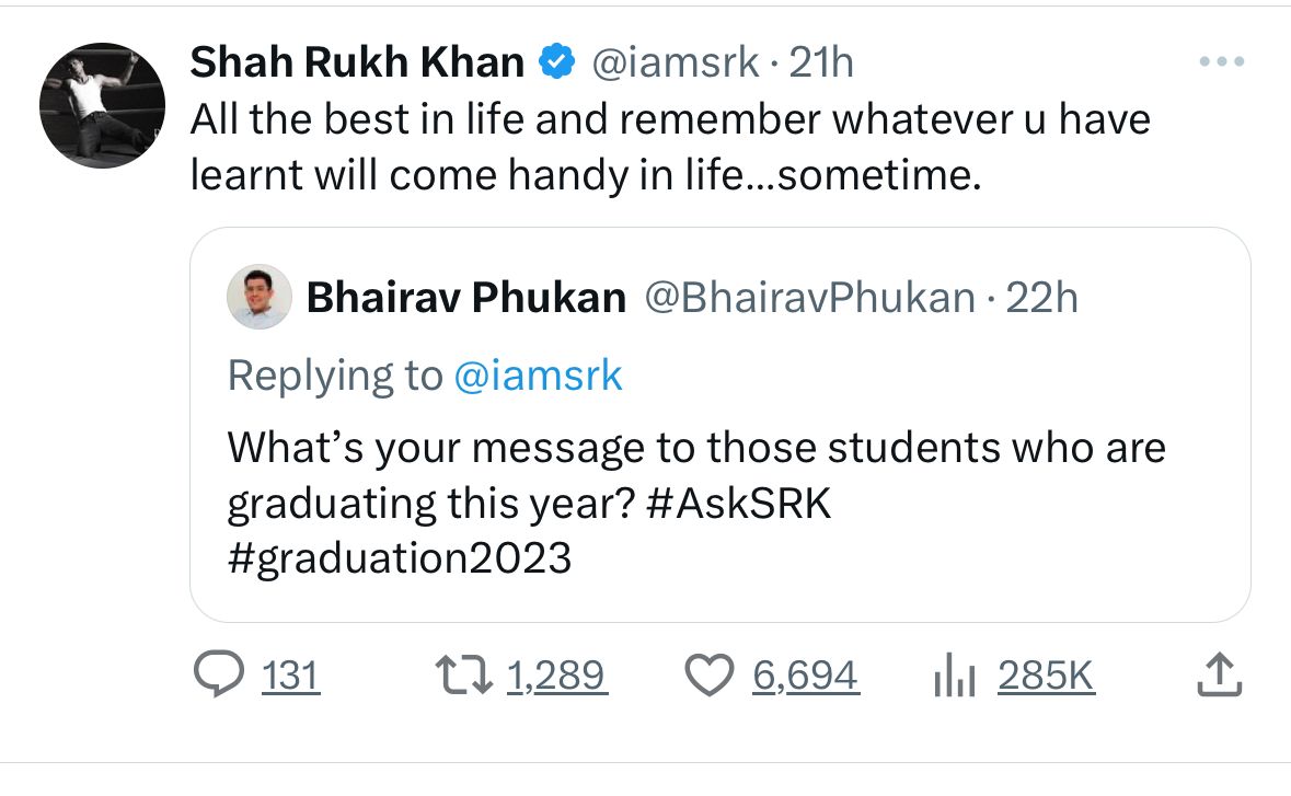 SRK said, “All the best in life and remember whatever u have learnt will come handy in life…sometime.