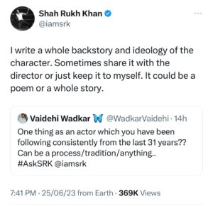 *One thing that he has been following consistently from the last 31 years SRK reveals* , I write a whole backstory and ideology of the character. Sometimes share it with the director or just keep it to myself. It could be a poem or a whole story.”