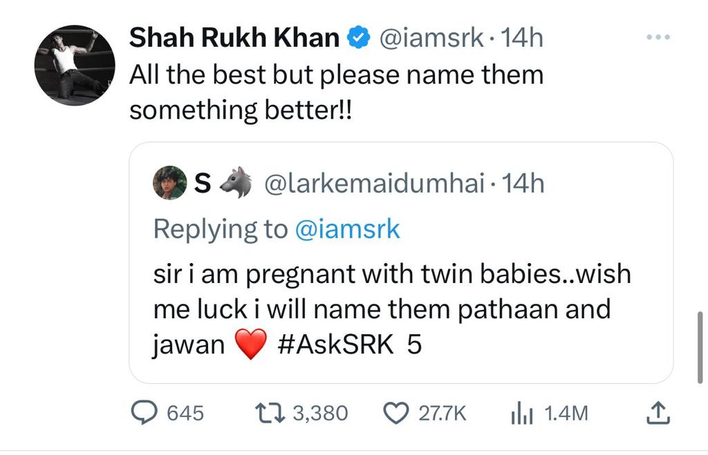 While a fan who is pregnant with twin babies informed SRK about naming them Pathan and Jawan, the actor replied, “All the best but please name them something better”!