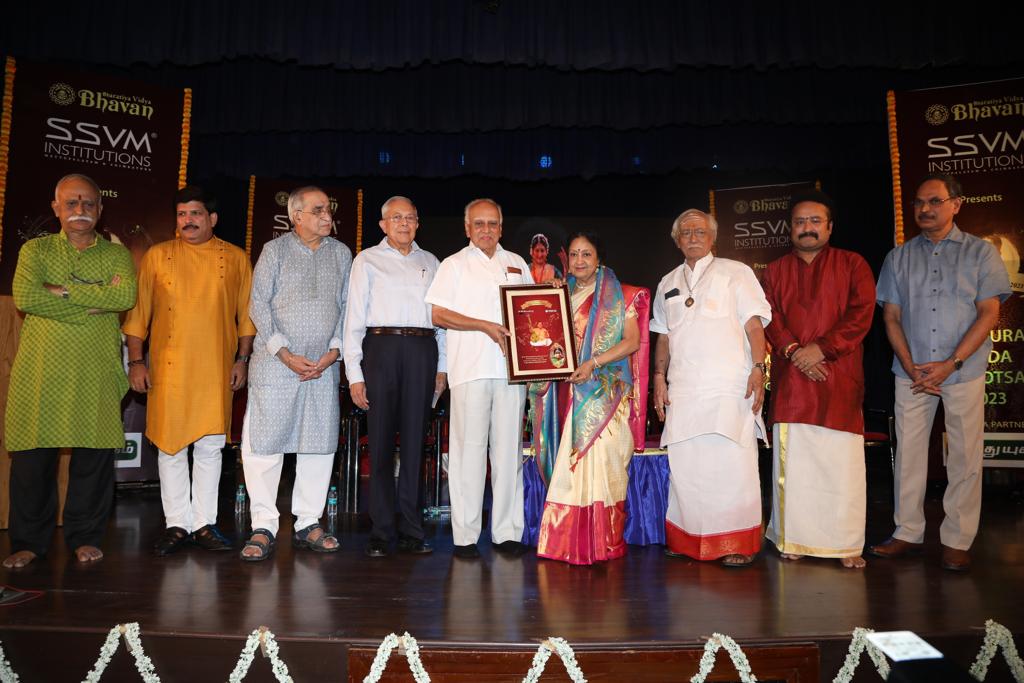 Dr.B.K.Krishnaraj Vanavarayar the philanthropist and Chairman of Bharatiya Vidya Bhavan Coimbatore Kendra bestowed Dr.M.Balamuralikrishna National Award for Artistic Excellence 2023 with the title Murali Nāda Lahari and a cash of Rupees One Lakh to Dr.M.Padma Subrahmanyam.