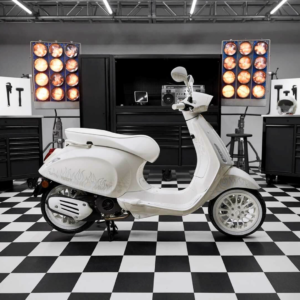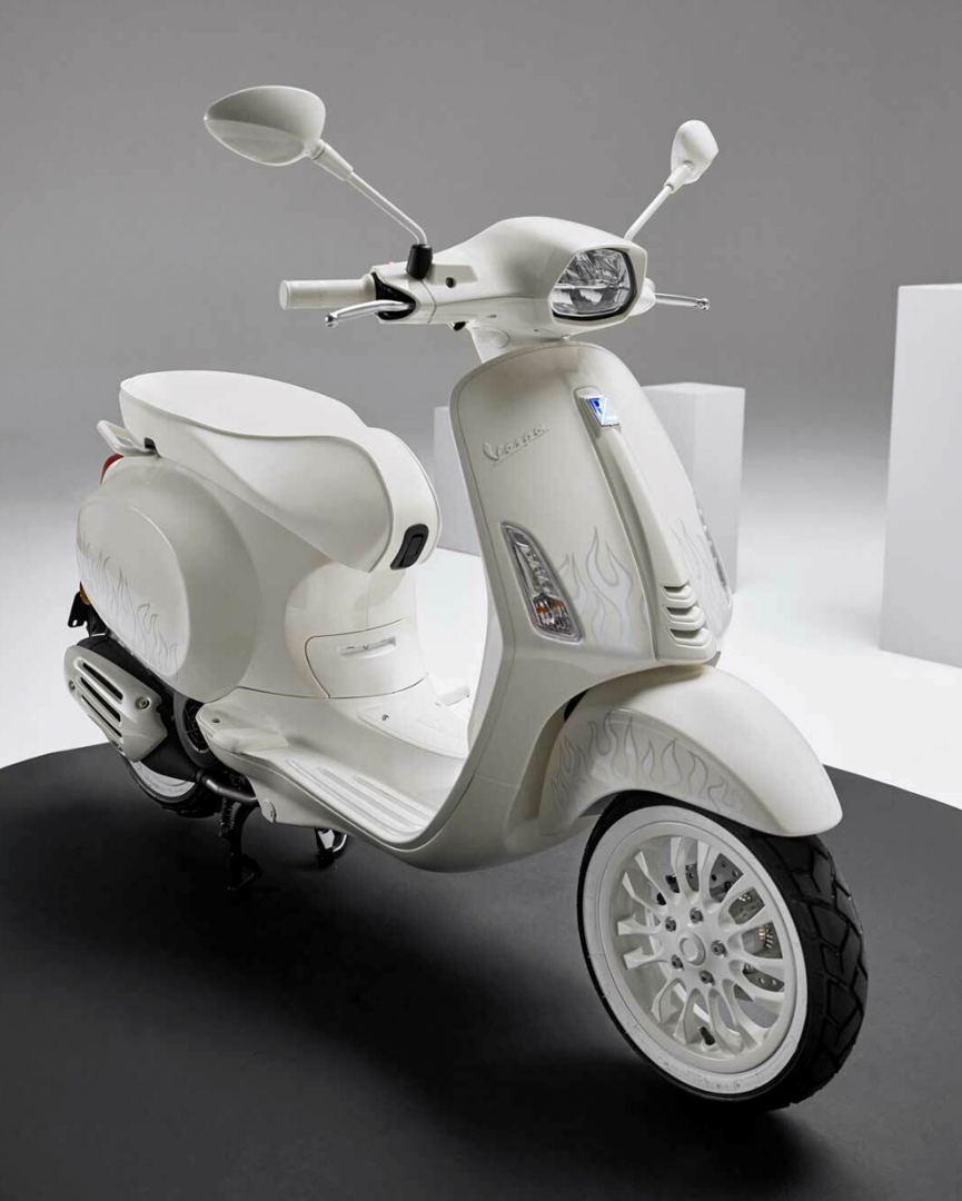 Glamorous and timeless, the new Vespa designed by Justin Bieber reflects his creativity. Monochrome is the underlying style feature that distinguishes the new Vespa signed by Bieber. White color, selected by the singer, passes through all elements of the new Vespa: from the saddle to the grips to the spokes of the rims. The brand logo and the flames drawn on the body of the vehicle are also tone-on-tone white.