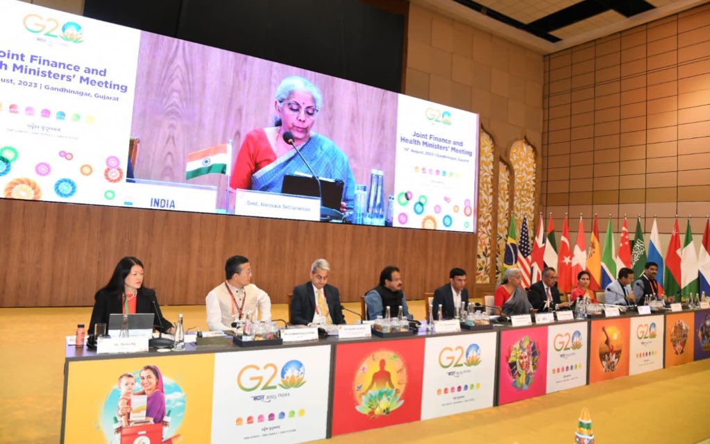 Chennai-22.08.2023-Under India’s G20 Presidency, the Joint Health-Finance Ministers Meeting was held in Gandhinagar, Gujarat on 19 August 2023, Saturday in hybrid mode. The meeting was attended by Health Ministers and Finance Ministers. It was co-chaired and opening remarks were delivered by Nirmala Sitharaman, Minister of Finance, and Shri Mansukh Mandaviya, Minister of Health, Government of India. Along with this, Dr. Tedros Ghebreyesus, Director General of WHO gave an update on global health from the perspective of emerging post-pandemic scenarios.